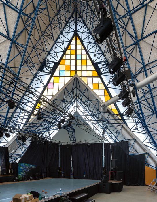 En plan, la composition se développe à partir d’un triangle équilatéral correspondant au chœur et évoquant la Sainte-Trinité. Les annexes paroissiales sont contenues dans un bâtiment oblong à deux niveaux. Le volume central de l’église est couvert d’une charpente métallique composée de six pans triangulaires montés en “parapluie”. La forme expressive de la toiture permet d’identifier facilement le lieu de culte au sein du quartier marqué par l’orthogonalité de ses constructions. Un projet de reconversion confié aux architectes du Groupe Acanthe est lancé en 1999 pour transformer l’église désaffectée en centre culturel. Réceptionnés en 2001, les travaux ont permis d’aménager l’espace intérieur de l’église en salle de spectacle tout en conservant les qualités du bâtiment d’origine : l’unité du volume intérieur, la visibilité de la charpente et la composition des façades.