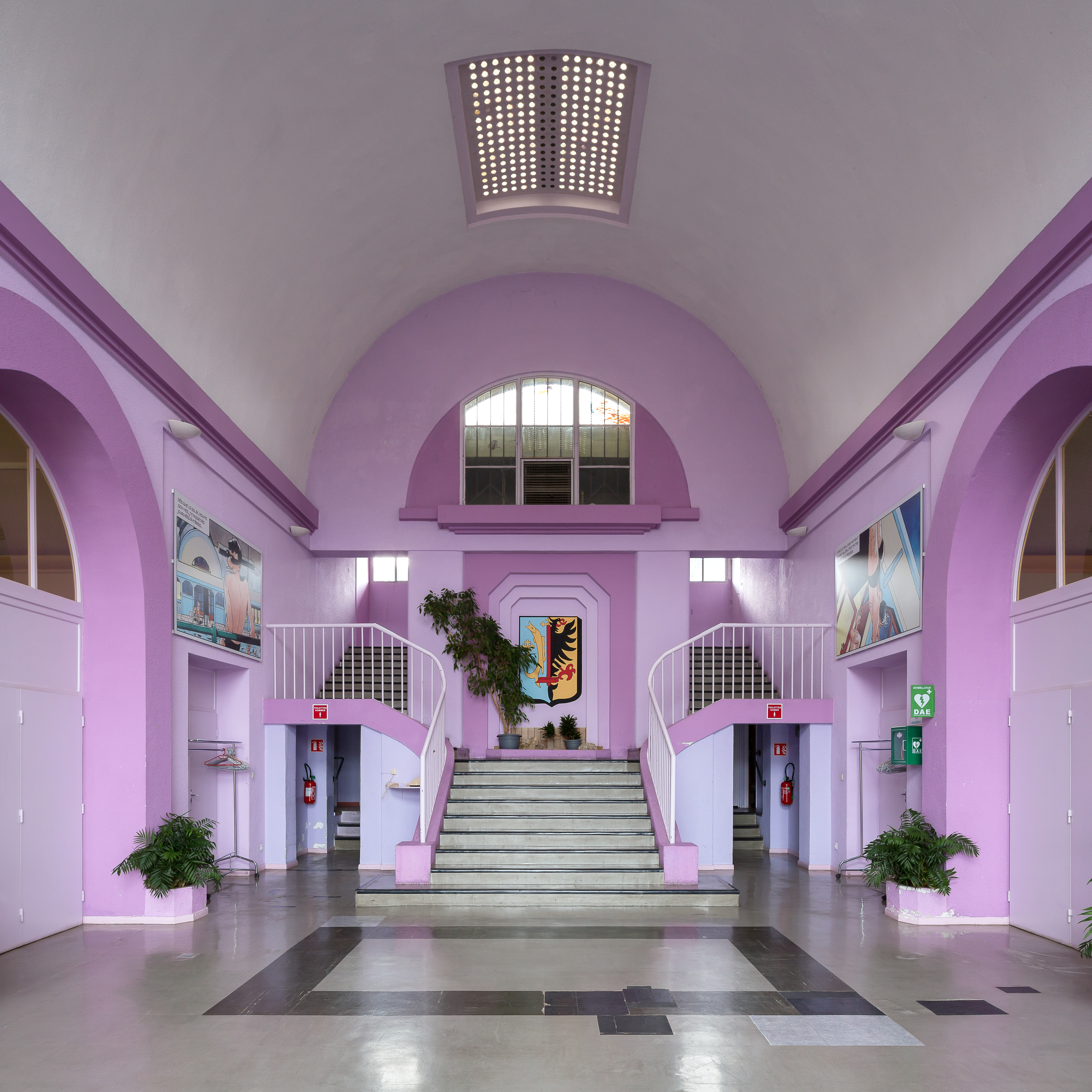 Ce complexe sportif, issu d’une politique patronale paternaliste, se situe aujourd’hui dans le quartier Salvador Allende, bordant la friche sidérurgique. L’usine ayant disparu, la salle polyvalente s’insère sur un axe structurant de la commune et le stade – implanté sur les hauteurs – s’ouvre sur un paysage recomposé voué à devenir un écoquartier. Ces deux équipements, réalisés dans l’entre-deux-guerres, s’inscrivent dans le style art déco tout en déployant une architecture résolument sobre et rationnelle issue des préceptes de l’architecture industrielle. L’architecture des bains-douches exploite les capacités techniques du béton armé, des arcs porteurs en plein cintre viennent soutenir de larges voûtes en berceau et libèrent l’espace intérieur. L’édifice est composé à l’aide de volumes simples. Un premier volume, orienté nord-sud et couvert d’une voûte en berceau, marque l’entrée. Il est flanqué perpendiculairement par deux volumes identiques également couverts de voûtes en berceau. Cette composition tripartite est lisible en façade : l’avant-corps central possède une géométrie simple et affirmée induite par les choix structurels opérés. L’attention se porte sur le dessin de la baie, le travail des ferronneries et leurs motifs géométrisés. En revanche, les deux corps latéraux sont traités avec une certaine sobriété. Quelques éléments de modénature horizontaux créent une continuité : un soubassement continu, un bandeau de béton reliant les bacs à fleurs ornant chaque baie et une corniche saillante. La distribution d’origine est simple et toujours lisible en plan : un hall central distribue les deux corps latéraux comprenant les douches et les bains. Cette composition rigoureuse et symétrique permet de distinguer l’aile Est réservée aux hommes de l’aile ouest réservée aux femmes. Cette dernière présente la particularité d’accueillir moins de douches pour réserver un vaste espace aux activités sportives. Enfin, le hall abrite également un escalier monumental permettant d’accéder à la piscine extérieure. La façade sud est ainsi flanquée d’une bande servante accueillant les douches et cabines liées à l’utilisation de la piscine de plein air. Aujourd’hui, les bains-douches ont conservé leur composition symétrique. Le hall sépare la salle à destination sportive de la salle à destination culturelle. Ces deux salles présentent de larges dimensions (13 x 16,5 m) permettent une grande diversité d’usage. La réhabilitation dessinée par Roger Morel permet de rendre lisible la structure de l’édifice et de souligner les détails art déco qui ponctuent l’édifice : bacs à fleurs géométrisés, frises moulurées, et verrières centrales. Le bassin extérieur de 12x30 m a été comblé avec les gravats des démolitions puis engazonné pour devenir une aire extérieure polyvalente. Il sert aujourd’hui de terrain d’entraînement au tir à l’arc et de théâtre de verdure où les gradins sont encore utilisés pour des représentations. Plus haut dans la pente, le stade Brandenburger est composé d’un terrain de football, de deux courts de tennis, d’un terrain de basket-ball et de pistes de courses. Il a conservé son portail d’entrée art déco en acier et sa tribune permettant de recevoir 900 spectateurs. Cette dernière présente la particularité de s’implanter dans la pente naturelle du terrain puisque les gradins en béton sont encastrés. L’auvent est soutenu par quatre poteaux métalliques placés à l’avant des gradins et une charpente tridimensionnelle composée de plusieurs poutres treillis en acier.