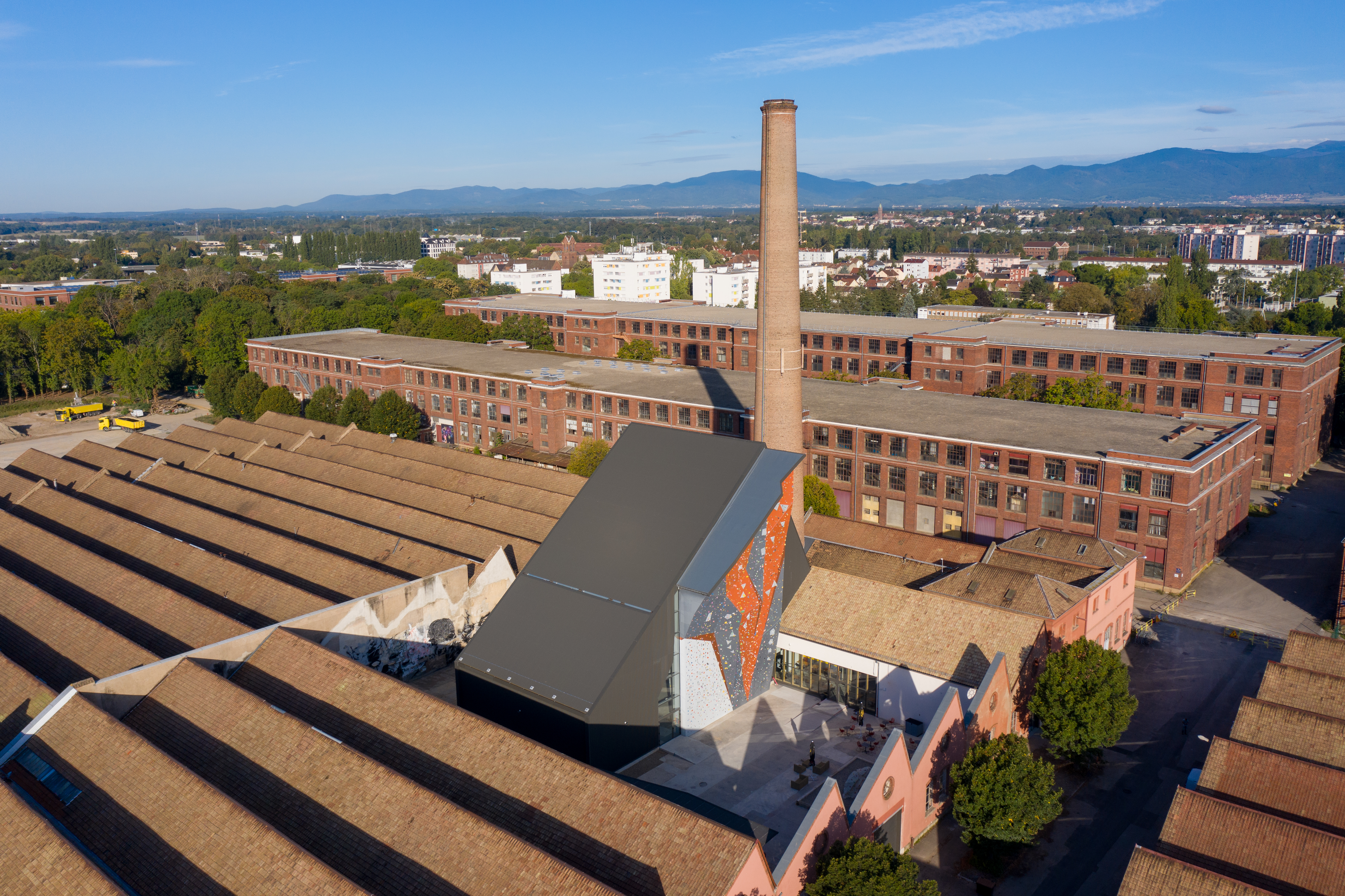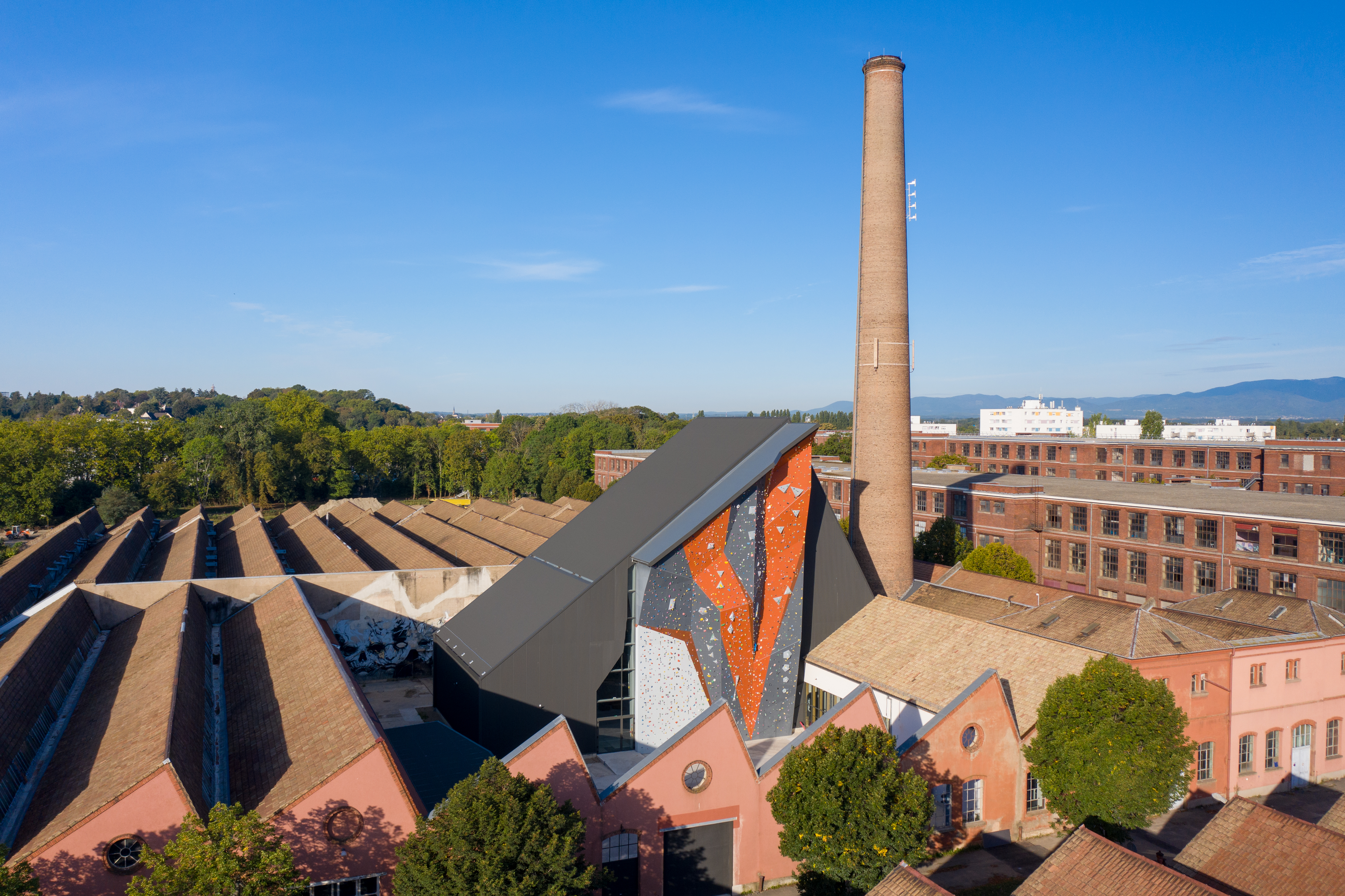 "Ce programme innovant tire parti d’un patrimoine industriel et de la riche histoire textile et sociale du site DMC. Le projet architectural, malgré un budget restreint, répond à différents enjeux : conférer une nouvelle image au site industriel, respecter la typologie existante en la réinterprétant, créer un équipement performant (plus grand mur d’escalade français) et mettre en valeur le passé industriel (nouveaux points de vue sur les sheds et la cheminée depuis les parcours extérieurs).