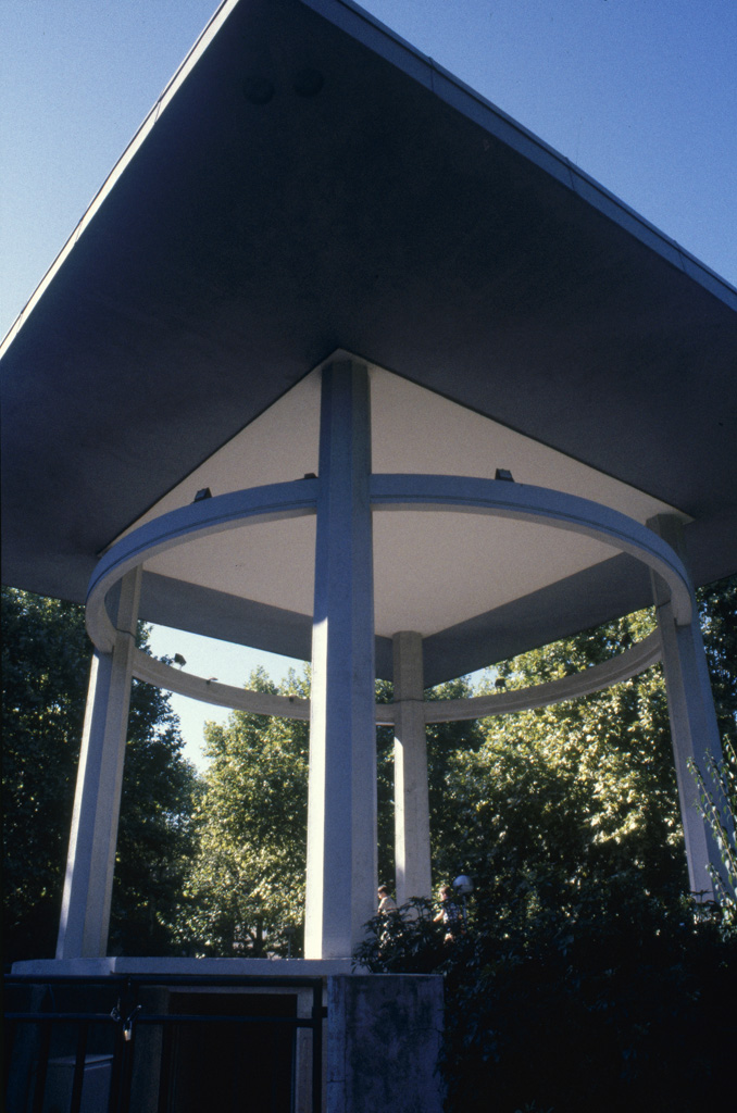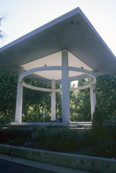 Kiosque à musique, entièrement en béton armé. Sur un podium, quatre colonnes cannelées supportent une couverture en terrasse horizontale. Une poutre circulaire, raidit l'ensemble, aux trois quart des colonnes. Cet anneau servait aussi de support à un rideau amovible fermant l'arrière de la scène. Sur les faces du podium s'adossaient des escaliers donnant accès à la scène ou aux locaux techniques se trouvant sous le podium, des jardinières et une fontaine ayant un décor céramique, des dauphins en céramique bleue crachant de l'eau qui, d'après Georges Dezeuze, auraient été commandées à Josep Llorens Artigas (1892-1980).