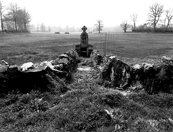 Fontaine porte le millésime : 1891 ; niche couronnée d'un fragment de croix ancienne 16e siècle ?, représentant le Christ en croix et la Vierge à l'Enfant ; niche abritant la statue de saint Jean-Baptiste