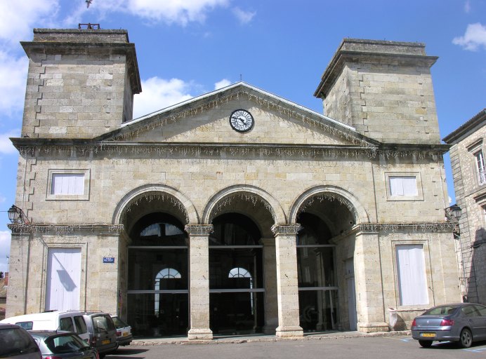 En 1594, la Ville achète une salle médiévale afin d’y transférer la maison commune et de bâtir une halle autour. On insère, dans les piliers de la galerie qui entoure la partie maçonnée, des tauroboles, autels de culte antiques, découverts lors de la reconstruction du chœur de la cathédrale en 1540. Pour des raisons d’hygiène, depuis 1807, la viande est obligatoirement vendue sur les étals établis sous la grande halle. Le bâtiment est jugé en mauvais état dès 1816, au point que la commune projette de le démolir en 1819 pour y ériger la statue du Maréchal Lannes. Entre 1820 et 1827, la gendarmerie s’y installe, suivie de l’école primaire pour les enfants indigents, dirigée par les frères de la doctrine chrétienne. En 1832, le projet de nouvelle halle est refusé par le Préfet car aucun moyen de financement n’est présenté. Une partie du toit tombe deux ans plus tard et le 10 août 1840 à 2h du matin, survient le grand incendie. Les habitants se mobilisent pour sauver l’édifice durant dix longues heures. Malgré l’ardeur des volontaires, rétribués en nature par la commune, sous la forme de pain, de viande et d’eau de vie, l’édifice est presque totalement détruit.£Pour la reconstruction estimée à 43 000 francs, sans les honoraires de l’architecte, une ordonnance royale autorise un emprunt de 30 000 francs. La commune acquiert la maison accolée à l’ouest pour la démolir afin d’offrir du dégagement à la nouvelle halle grâce à la création d’une rue parallèle à l’actuelle rue Montebello. Elle l’achète 13 000 francs aux époux Roussille et Ganin.£Les plans de la nouvelle halle sont l’œuvre du Monsieur Aurez et Nicolas Dostes, domicilié à Castéra-Lectourois, est choisi en tant que tailleur de pierres. Les travaux sont surveillés par le Monsieur Lagarde, architecte domicilié à Miradoux, vite remplacé par Monsieur Ester, ingénieur des Ponts et Chaussées. Monsieur Solirène est surveillant.£La pierre est extraite sur la commune, à la carrière de Bordeneuve. L’hiver 1842-1843, une immense quantité de matériaux est stockée sur la Place d’Armes et sur le Petit Bastion (à l’entrée de la ville) les deux sites suffisant à peine à contenir toutes les pierres. Les travaux commencent le 8 août 1843. En février 1844, on cherche de la pierre dure pour les limons et les marches des escaliers. On la trouve à Lestalon, à Hourquet et à Barrats mais ces carrières étant plus éloignées que celle de Bordeneuve, l’extraction occasionne un surcoût.£La première pierre est posée à l’angle nord-est de l’édifice le 1er juin 1844. On pratique une incrustation pour y placer une monnaie d’argent de 5 francs à l’effigie de Louis Philippe 1er portant le millésime 1843. On la recouvre ensuite d’une plaque de plomb portant le nom du roi, du maire, des adjoints et des conseillers municipaux.£Les pierres de l’édifice précédent s’avèrent inutilisables, ce qui augmente encore le coût des travaux. Il est difficile de trouver des pierres pour le grand appareil de maçonnerie, on continue donc l’extraction l’hiver dans l’espoir de finir les travaux en janvier 1845. D’octobre 1844 à juin 1845, on va chercher la pierre à la carrière de Maron, sur la commune de Terraube. Le 1er septembre 1846, est signé le procès-verbal de réception provisoire des ouvrages de la halle. On procède ensuite aux finitions et à la réparation d’un oubli : la mise en place de châssis à vitrages aux fenêtres. L’ensemble des travaux se révèle encore plus coûteux que prévu car le projet initial n’avait pas tenu compte de la déclivité est-ouest et un simple pavé en cailloux avait été prévu au sol. Le procès-verbal de réception définitive des travaux date du 9 août 1848. La dépense totale s’élève finalement à 52 209 francs.£En janvier 1852, concernant les châssis à vitrage, le Conseil municipal opte finalement pour le métal plutôt que pour le sapin du nord. Chacun des châssis pèse 380 kg et les vitres sont protégées par un treillis en fil de fer maillé. Le carrelage intérieur n’est terminé que l’été 1854 car les carreaux sont plus grands que ceux dont on se sert habituellement : ils sont moulés spécialement pour la Ville de Lectoure et produits au fur et à mesure des besoins.£Le pavage en « cailloux roulés » des rues adjacentes n’est effectué qu’en 1855 et en décembre de cette même année, on hésite à choisir une horloge électrique mais on préfère une horloge à poids, plus commode d’entretien.£L’escalier en vis du pavillon sud-ouest a été démonté en 2015.