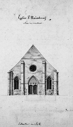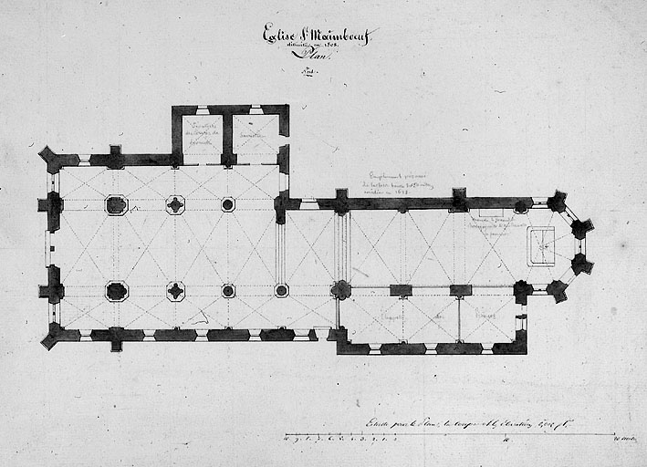 Date de fondation de l'église primitive dédiée à saint Pierre inconnue ; passa sous le vocable de Saint-Maimboeuf à la fin du 9e siècle ou au début du 10e siècle lors du transfert des restes de ce Saint dans cet édifice ; 1135 le comte Thierry II y fonde un chapitre d'augustins ; travaux de reconstruction en 1080, puis dans la 1ère moitié du 12e siècle et consacrée en 1149 (subsistaient au début du 19e siècle les murs gouttereaux de la nef charpentée) ; 14e siècle, nef voûtée d'ogives et choeur reconstruit sur crypte ; 15e siècle, réédification de la 1ère travée de la nef, de la façade et au moins de la partie haute du clocher ; 1538 passe au culte luthérien (appelée dès lors église allemande) ; en 1563 établissement d'une couverture en cuivre sur le clocher ; 1628 écroulement du clocher qui ne sera jamais reconstruit malgré des projets par Jean flamand en 1628 et d'autres en 1753, 1754, 1759 et 1764, 1765 ; pillée en 1793 et totalement détruite en 1808 ; ensemble de chapiteaux récemment retrouvés et déposés au musée du château