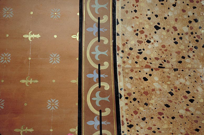 sujet : croix latine, support : clocher mur ; sujet : croix de Malte, fleur de lys, support : peint sur les murs du choeur