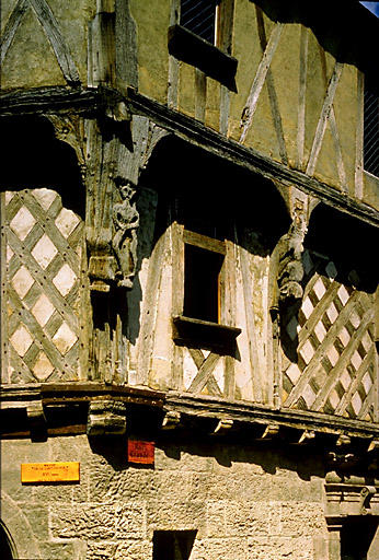 Rez-de-chaussée en pierre de taille, étages en pan de bois avec essentage d'ardoise pour l'élévation sur cour ; sous-sol à plusieurs pièces et couloirs en partie voûtés