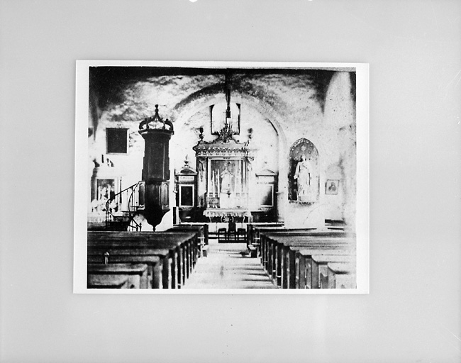 1ère église de plan allongé à deux vaisseaux, couverte en lambris ; bras sud du transept couvert en lambris ; échauguette, couverte d'un toit conique ; 2e église à trois vaisseaux voûtée d'ogives ; clocher couvert d'une flèche polygonale