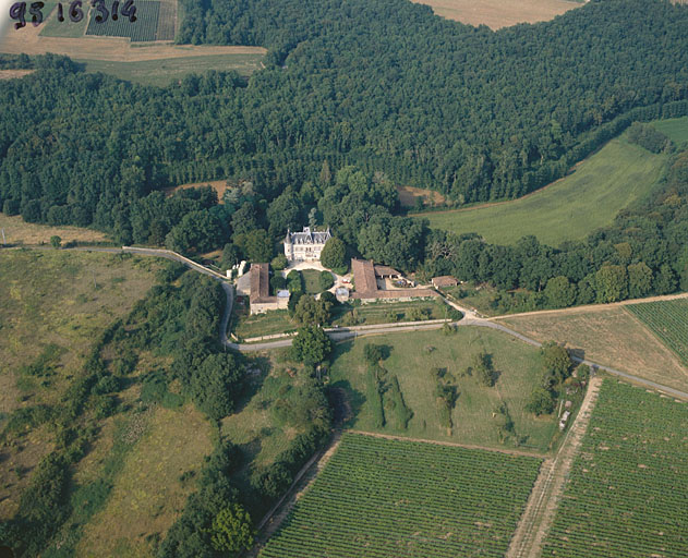 Château en pierre de taille et couvert d'ardoise ; bâtiments de ferme et communs en moellon et tuile creuse