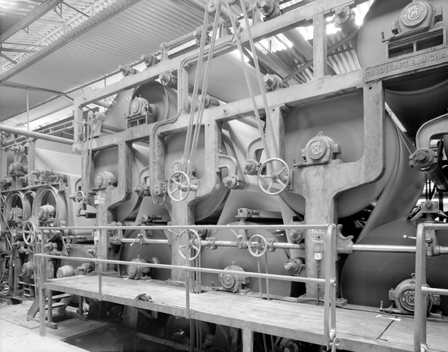Atelier de fabrication (1a) dit salle de la machine, atelier de fabrication (2) dit du Pulper et atelier de réparation (3) en pierre de taille, en rez-de-chaussée et avec ciment amiante en couverture ; atelier de fabrication (1b) en béton et acier, avec charpente métallique apparente et toit avec lanterneau en ciment amiante ; magasin (4) et entrepôt industriel (5) en moellon enduit, à un étage, couverts de tuile mécanique ; logement patronal (8) en moellon et en pierre de taille, à un étage, couvert de tuile creuse et d'ardoise