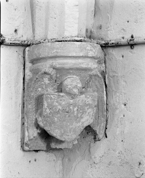 armes de la famille de Courcelles entourées d'une couronne tressée, support : clé de voûte de la chapelle seigneuriale ; sujet : anges porte écu, support : culots de la chapelle seigneuriale et console de la nef ; sujet : feuillage et devise, support : carreaux de terre cuite vernissée de la chapelle seigneuriale