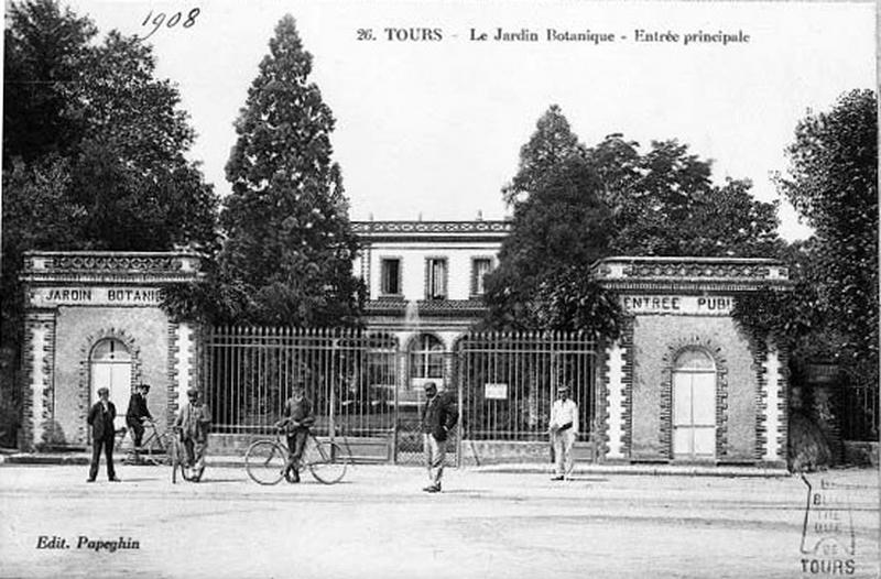 1813 : les terrains marécageux du ruau Sainte-Anne sont concédés à l'hôpital ; 1832 : au cours d'une séance de la société d'agriculture, sciences et arts du département d'Indre-et-Loire, Jean Anthyme Margueron présente un projet de jardin botanique et de naturalisation ; 1838 : le maire de tours, Auguste Walvein fait assécher les terrains de l'ancien ruau ; 1841 : création d'une école préparatoire de médecine et de pharmacie qui rend nécessaire la création d'un jardin botanique ; août 1842 : nouveau projet présenté à la société d'agriculture sciences et arts du département par monsieur de Sourdeval ; l'architecte Chauveau dresse des plans et propose un devis pour l'établissement du jardin botanique ; septembre 1842 : les plans et le devis sont envoyés par la société au préfet ; octobre 1843, septembre 1844 : aménagement du jardin sous la responsabilité de J.A. Margueron, les bâtiments réalisés (pavillons d'entrée, orangerie) ne correspondent pas exactement aux dessins donnés par Chauveau en août 1842, construction des serres ; mai 1866 : plans de Ch. Loyau pour un pavillon abritant une piscine et 2 volières, réalisé fin 1866 ; 30 avril 1869 : incendie des serres et de l'orangerie ; 15 juin 1869 : devis dressé par l'architecte E. Auger des travaux à faire à l'orangerie ; 24 juillet 1869 : adjudication des travaux aux serres et à l'orangerie : les serres sont reconstruites avec agrandissement, l'orangerie est transformée en un jardin d'hiver ; mars 1876 : projet de construction d'une serre à multiplication par H. Prath, cette serre sera construite en 1876, 1877 ; octobre 1888 : plans par H. Prath pour une surélévation de la maison du jardinier en chef (ancienne orangerie) , ces travaux seront exécutés à partir de 1889 ; avril 1890 : projet d'une nouvelle serre à multiplication par Montas, réalisée en 1890 ; fin 1904 : construction d'une serre pour abriter la collection d'azalées qu'Alfred Mame avait constituée dans son château des Touches à Savonnières et qui fut léguée au jardin botanique par son gendre le colonel maître ; 1909 : construction d'un pavillon rustique pour abriter les daims ; 1926 : reconstruction à l'identique de la grande serre ; juillet 1932 : projet de surélévation du toit de la grande serre en lui donnant une forme de comble brisé, non réalisé