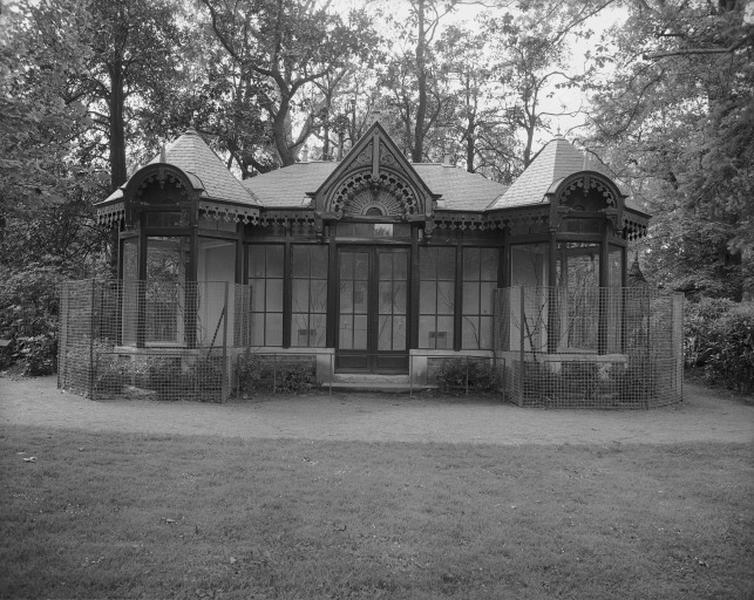 Serre à façade de pierre ordonnancée ; pavillon abritant les volières décoré de bois sculpté à l'extérieur ; pavillon des daims à toit polygonal