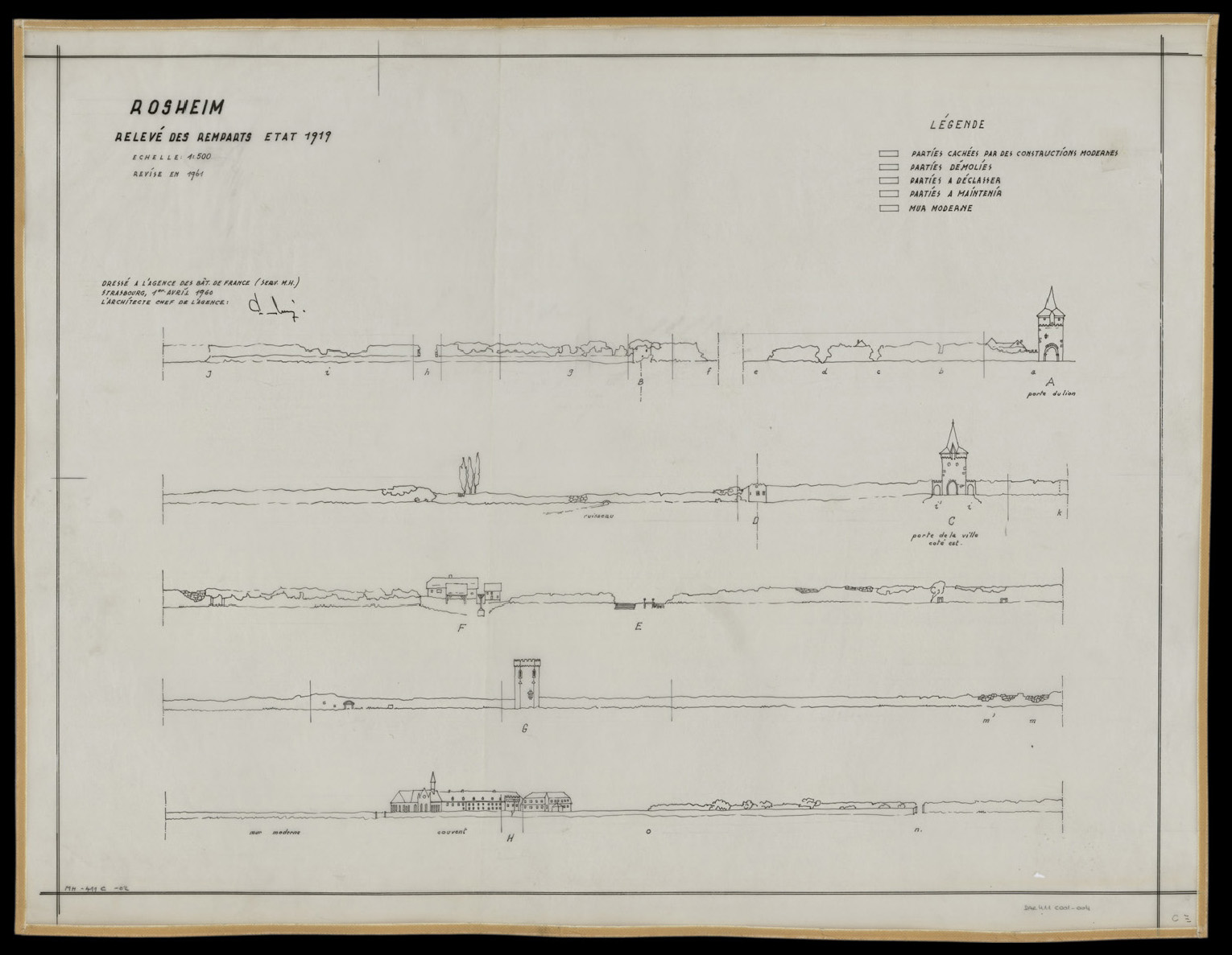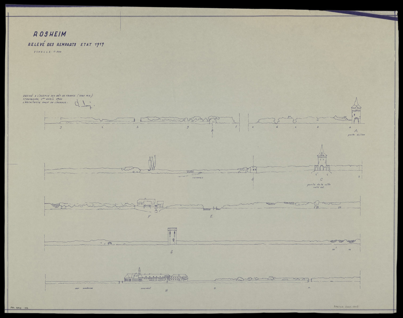 En 1218, lors de l'invasion des Lorrains, Rosheim n'est protégée que par une levée de terre avec palissade ; l'enceinte intérieure en pierre est construite au 13e siècle, avant 1267 ; l'enceinte extérieure en pierre daté du 14e siècle ; après le bombardement de l'agglomération par les troupes de Mansfeld en 1622, on remonte le mur extérieur et les tours à partir de 1648 ; modifications au cours du 19e siècle : enceinte extérieure réduite en hauteur en 1835, démolition de la porte ouest ; au début du 20e siècle, démolition du mur nord de l'enceinte extérieure, marque de tâcheron, daté par travaux historiques