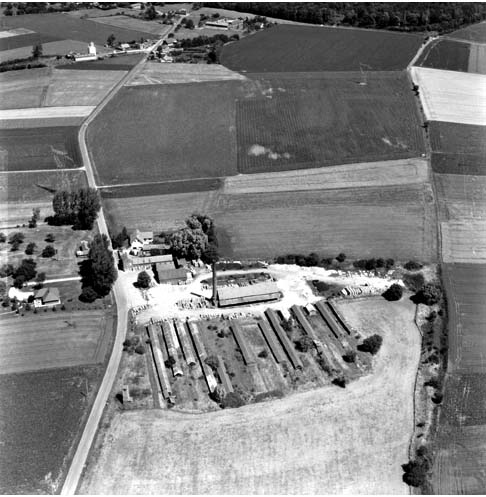four industriel ; cheminée d'usine ; voie ferrée ; pièce de séchage ; aire des matières premières ; logement patronal ; bureau d'entreprise