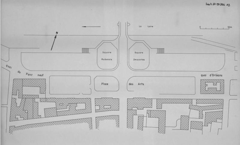 En 1687, la rue du Broc relie le carroi de Beaune à la Loire dans le prolongement de la rue Traversaine ; des 1688, un arc de triomphe (cf dossier) et une demi lune sont construits au bord de la Loire ; à partir de 1767, la percée royale avec le nouveau pont (cf dossier) de la route royale numéro 10 fait de l'artère nord sud l'artère principale de la ville ; l'arc de triomphe est démoli et une place est dessinée (voir dossier ensemble d'édifices derrière façade de la rue nationale) ; tout au long du 19e siècle des projets de maisons voient le jour autour de la place face au fleuve : en 1840 et 1850, l'architecte Gustave Guerin dessine les immeubles de part et d'autre de l'hôtel de ville et du musée (aujourd'hui démolis) ; la place de l'hôtel de ville au 19e siècle devient place des arts lorsque la mairie déménage et enfin place Anatole France depuis la dernière guerre. Secteur sauvegardé daté du 18 octobre 1983.