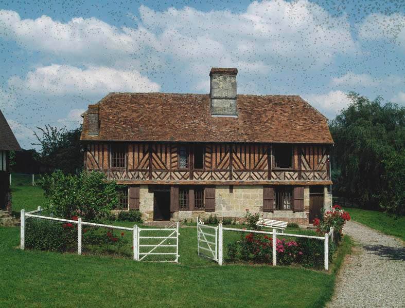 cour ; jardin potager ; verger ; resserre ; bûcher ; étable ; laiterie ; grange ; pressoir à cidre ; cellier