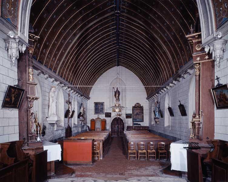 Clocher en brique, couvert d'une flèche polygonale ; nef et choeur en pierre enduite, couverts d'un toit à longs pans ; sacristie en brique, couverte d'un toit en croupe polygonale