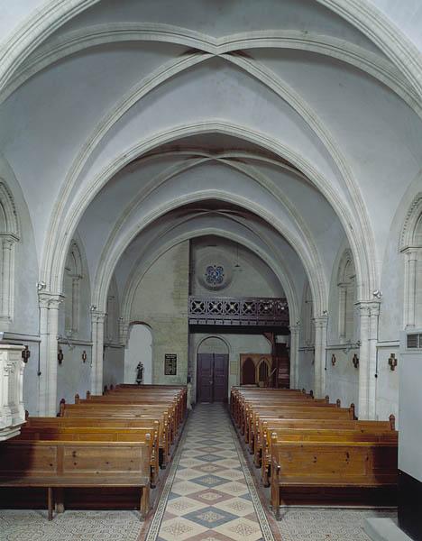 Eglise construite en moellon, étages du clocher en moellon et pierre de taille, moellons disposés en épi sur la partie inférieure du clocher et sur les murs de la nef ; nef et choeur voûtés d'ogives à l'exception de la 1ère et de la 6e travée de la nef couvertes d'un berceau brisé (lambris de couvrement sur la nef avant restauration)