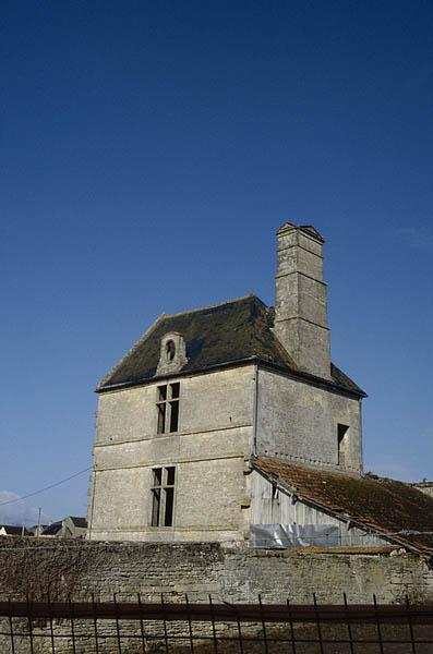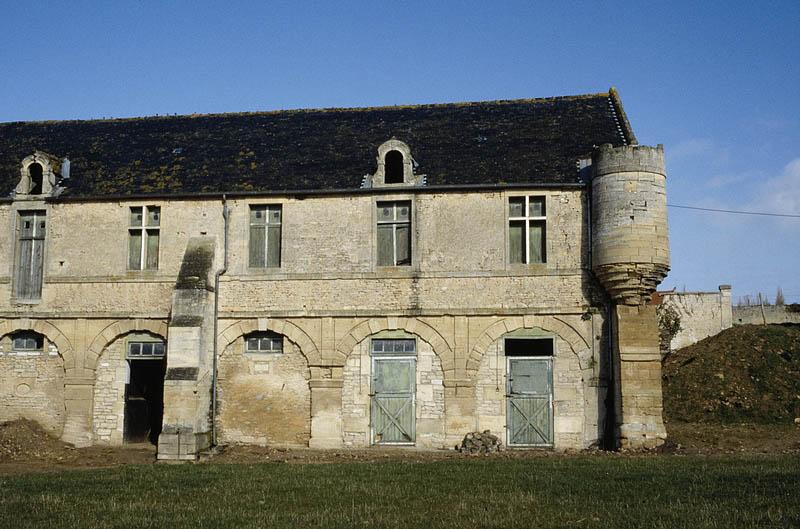 Logis : aile nord à 2 étages, 1 travée construite, aile est seulement amorcée, à 1 étage, peut-être destinée à être couverte en terrasse, tour sur l'angle nord-est comprenant des départs de voûtes de forme indéterminable, voûte en berceau plein-cintre dans le couloir au rez-de-chaussée de l'aile est, moellon enduit, toit à croupe sur l'aile nord ; corps des galeries : ouvert au rez-de-chaussée, fermé à l'étage, pierre de taille pour le 1er niveau, moellon enduit pour le 2e, escalier dans-oeuvre en pierre, tournant à retours sans jour, les contreforts, la tourelle et le mur pignon est ont été ajoutés après coup ; ferme : moellon, ardoise et tôle ondulée en couverture, pignon découvert, logement d'1 étage en moellon enduit ; colombier : moellon, toit en pavillon