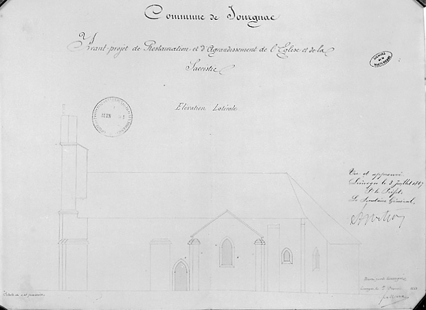 Eglise paroissiale Saint-Pierre-Es-Liens construite au 12e siècle ; remaniements au cours du 2e quart du 18e siècle ; date portée : 1736, ornant un panneau grillagé fermant un passage assurant autrefois la communication entre l'église et une galerie du château ; en 1749, travaux confiés au maître maçon Jean Laumonerie ; en 1885, construction des chapelles latérales, agrandissement de la sacristie et réfection de la voûte en brique, suivant les plans de l'architecte F. Merx dressés en 1863 ; pierre de taille provenant des carrières des places, dans la commune de Saint-Hilaire Lastours, brique provenant des environs de Jourgnac, et chaux hydraulique, des fours de la Dordogne et de la Charente ; charpente et planchers exécutés en bois de chêne ; entre 1896 et 1899, reconstruction du clocher mur suivant les plans de l'architecte H. Lemasson ; en 1926, réparation de la couverture de la sacristie