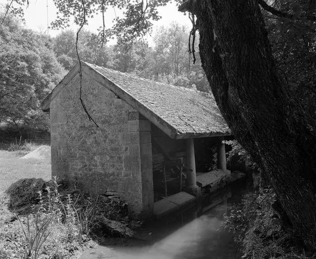 Petit bâtiment situé à l'ouest du hameau, ouvert côté ruisseau ; murs latéraux aveugles ; toit à longs pans asymétriques avec avancée en façade ; sablière supportée, à l'aplomb des fermes, par deux colonnes tronconiques délimitant trois travées de niveaux différents : travée centrale de plain pied avec le seuil, travées latérales plus basses accessibles par deux degrés droits rentrants ; pierres à laver en pierre de taille ; sol dallé ; tablette de pierre de part et d'autre de la porte d'entrée