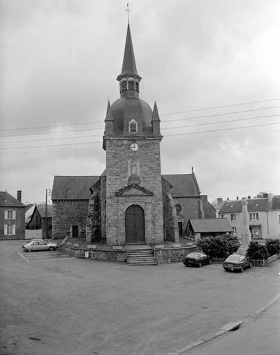 Eglise de fondation romane (vestige mur nord de la nef) relevée au 15e siècle. La porte ouest du bras nord du transept provient de la chapelle de La Heuzelaye. Clocher et bras nord du transept construits vers 1830. Un ossuaire, attesté par un dessin de 1848, était accolé au mur sud de la nef. Reconstruction partielle de l'église en 1869 par l'architecte Jean-Marie Commereuc à la suite d'un incendie qui détruisit le choeur, le bras sud du transept et la sacristie. Décor peint daté 1977.