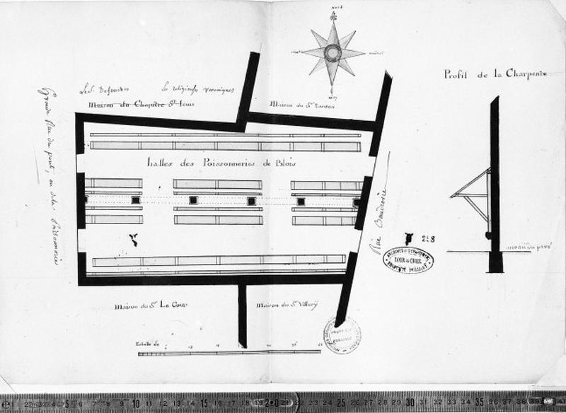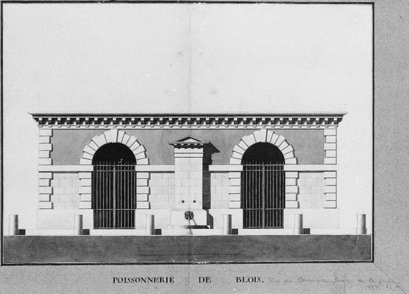 La halle aux poissons existe sans doute dès le 13e siècle et dépend du domaine comtal. Selon la tradition orale elle aurait été reconstruite grâce aux dons de François 1er avant 1525 ; les piliers et arcades à l'intérieur de la halle dateraient de cette période ; en 1783 le domaine royal aliène la poissonnerie à un particulier qui entreprend des travaux pour la remise en état de la charpente et du pavé ; saisi et vendu aux enchères à la Révolution, le bâtiment devient propriété de la ville ; en 1806 l'architecte Pinault entreprend d'importants travaux ; l'ancienne façade sur la rue de la Poissonnerie et la fontaine sont détruites. La nouvelle façade sera reculée d'un mètre par rapport à l'alignement de la rue, ce qui permettra de dégager l'entrée du bâtiment et d'adosser une nouvelle fontaine sans gêner la circulation ; la charpente et la toiture sont aussi entièrement refaites ; en 1902 on ajoute en façade au-dessus de la corniche un étage attique et un fronton ; à l'intérieur les murs sont recouverts de carreaux de faïence ; bombardé en 1940 le bâtiment est détruit, les pierres de deux piliers et d'une arcade ont été remontées dans la cour des jacobins.