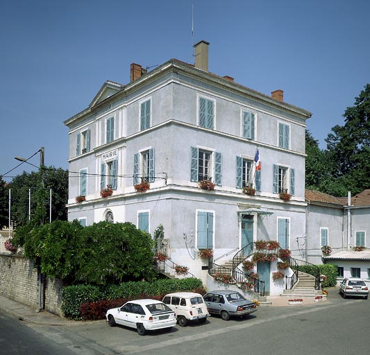 Le bâtiment est constitué d'un corps de logis de plan carré (mairie) , de communs de plan en L en retour sur cour ouverte (annexes et garages) , et d'une dépendance (salle des fêtes) formant le 3e côté de la cour ; construction en pisé, sur étage de soubassement en moellons de calcaire ; le corps de logis comprend un étage de soubassement avec pièce voûtée ouvrant sur la cour, un rez-de-chaussée surélevé et deux étages carrés ; il est couvert d'un toit en pavillon de tuiles plates mécaniques, avec fronton pignon à deux versants ; le rez-de-chaussée est accessible par deux escaliers extérieurs, l'un en fer à cheval (élévation latérale sur cour) , l'autre donnant sur la terrasse en terre plein qui borde l'élévation antérieure sur rue ; élévations à travées régulières, travée axiale de la façade principale marquée par un très léger avant corps à fronton, avec porte d'entrée en plein-cintre et fenêtres encadrées de pilastres ; communs de deux niveaux, couverts de tuiles creusé s ; salle des fêtes de plan rectangulaire, de deux niveaux, couverte d'un toit à longs pans de tuiles mécaniques, fronton pignon découvert plaqué en façade