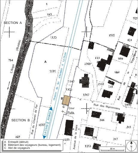 bureau d'entreprise ; logement ; quai ; abri de voyageurs ; puits ; cour