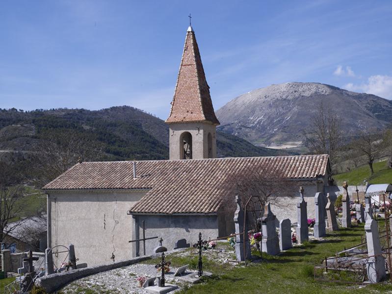 L'église Notre-Dame-de-l'Assomption est traditionnellement datée du 16e siècle. Le clocher, qui n'apparaît pas sur le plan cadastral de 1837, a probablement été construit en 1875 comme l'indique le chronogramme inscrit sur son élévation ouest. En 1888, d'après un état dressé par l'architecte Thunin, de Barrême, l'église nécessite d'importants travaux de réparation et d'assainissement. Le conseil municipal constate alors qu'il est urgent d'exhausser les murs de l'église, de réparer la sacristie et d'assainir le sanctuaire. Le chronogramme 1888, sur la façade de l'église, a probablement été gravé lors de cette campagne de travaux. En 1891, une visite pastorale témoigne du très bon état de l'édifice. Au cours des dernières années, les élévations extérieures et la couverture ont été refaites. Aujourd'hui, seules la nef et l'abside sont accessibles, les bras du transept en mauvais état ont été murés. L'abside était ornée d'un décor peint probablement de la fin du 19e siècle. Aujourd'hui ce décor est en partie dissimulé par une couche de peinture monochrome en mauvais état. Une croix monumentale porte la date 1853. Le projet d'extension du cimetière voit le jour en 1910. En 1913, les travaux d'agrandissement sont terminés.