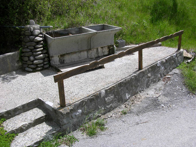Lavoir à deux bacs en ciment moulé. Fontaine récente en maçonnerie de galets.
