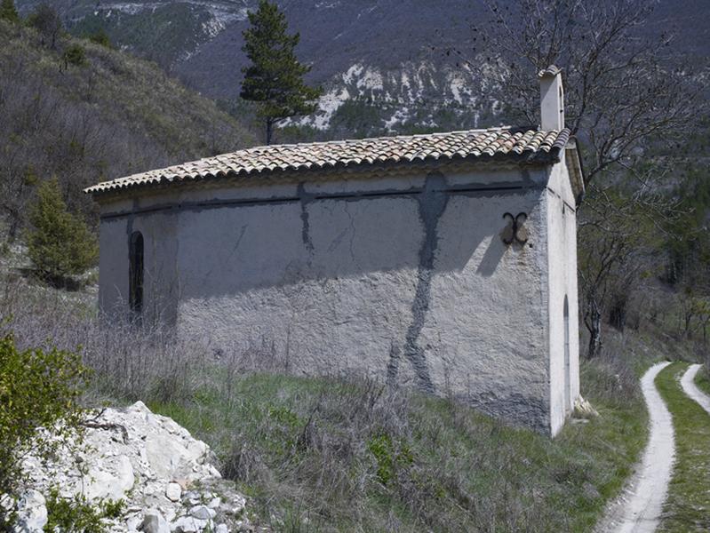 Située au nord-ouest à la sortie du village, la chapelle est desservie par la voie communale 2 qui conduit à Méouilles. De plan allongé, elle se compose d'une nef unique à deux travées en plein cintre séparées par un arc doubleau. L'abside, voutée d'ogives, est délimitée par un chevet à trois pans. L'édifice est couvert d'un toit à longs pans en tuiles creuses et d'un toit polygonale au niveau du chevet. La couverture est soulignée par deux rangs de génoise maçonnée. La façade en pignon se compose d'une porte en plein cintre et d'un oculus. Un clocher-mur à une baie en plein cintre est couvert d'un toit à deux pans sommé d'une croix en fer forgé. La façade en pignon conserve des traces de décors et d'inscriptions peintes. Les élévations extérieures sont consolidées par une ceinture métallique et présentent des raccords en ciment. L'intérieur de la chapelle est éclairé par un oculus au sud-est et par trois ouvertures en plein cintre percées dans chaque pan du chevet.
