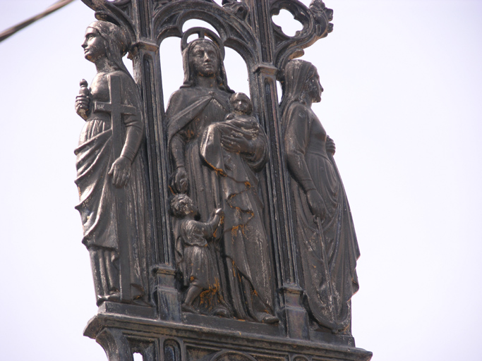 La face principale de la croix en fonte est ornée d'un Christ en croix rapporté. Les trois figures des Vertus Théologales : Foi, Charité, Espérance, forment la partie inférieure du montant.
