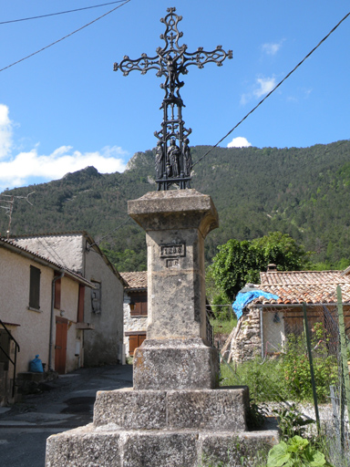 Cette grande croix est située en contrehaut de la place de l'église. La base, en pierre de taille de grès, est constituée de deux gradins surmontés d'un fût de section carrée avec une corniche massive en entablement. L'ensemble est sommé d'une croix de fonte industrielle, peinte en noir. La date et les initiales sont sculptés en réserve dans un cartouche sur le fût.