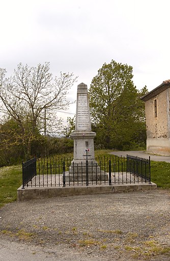 Le monument aux morts, entouré d'une grille en fer de couleur noire avec un portillon à double battants en façade, est constitué d'une semelle en béton de plan carré sur laquelle ont été récemment posées des dalles gravillonnées. Au-dessus, le monument en granit des carrières de Lacrouzette du département du Tarn, est composé d'une marche taillée avec une pente, d'une assise formant socle avec chanfrein, d'une base moulurée, d'un fût avec un léger fruit, d'un chapiteau taillé et d'un obélisque terminé en pointe de diamant. Sur l'obélisque est fixée une plaque de marbre blanc (dimensions : h = 126, la = 50) comportant au-dessous de la dédicace la liste, gravée et peinte en noir, des noms, prénoms et dates du décès de chacun des dix soldats morts en 1914-1918. Une croix en fer de couleur noire est située sur le portillon de la grille de protection. Chaque poteau d'angle, en fer noir, est terminé par un décor végétal.