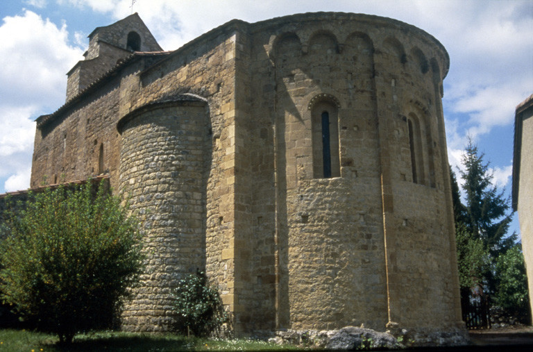 L'égllise n'est mentionnée pour la première fois que dans un compte de décime de 1382 (ecclesia de Montegaudio, Perrin1972, I, V, Couserans, p. 404.). Sa situation temporelle aux XIe et XII n'est pas claire car le village était alors situé à ma frontière entre les pagus de Comminges et de Couserans. Deux phases de construction peuvent être observées : une première maçonnerie de petits moellons en grés dans les parties basses de l'abside et des chapelles latérales, décorées de trois fenêtres à bandeaux et arcatures à bandes lombardes garnies de têtes datables de la fin du XIe siècle. La seconde phase de construction datable du second quart du XIIe siècle, concerne les parties hautes, en pierre de taille, et les types de couverture, en berceau pour le chœur et en cul-de-four pour les trois absides. Extrait de Natacha Piano, Locus Ecclesiae, p.309.£En 1967, des travaux de restauration sont en cours lorsque l'on fait reconstruire les absidioles latérales dont il restait des parties des culs-de-fours et des couvertures.