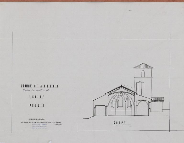 Un acte de 1240 de l'abbaye de Caunes mentionne le nom du chapelain de l'église d'Aragon. L'église paroissiale Notre-Dame est citée dans l'Enquête de 1269. En 1525, il est question de réparations à faire à l'église. Une nouvelle sacristie voûtée fut construite en 1890 au sud du chevet. La nef unique fut couverte de fausses voûtes d'ogives au 19e siècle. La première travée de la nef s'écroula en 1988 et révéla une charpente peinte des premières années du 14e siècle. Les corbeaux et les pannes faîtières peints furent dégagés et la première travée de la nef fut reconstituée dans son état d'origine. Les corbeaux et les pannes sont actuellement exposés dans l'église.