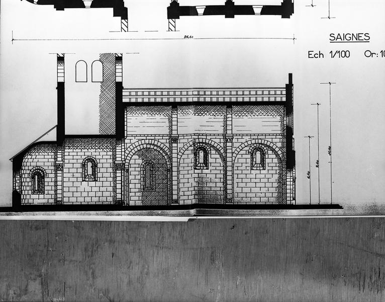 L'abside, le clocher, la partie supérieure des murs gouttereaux et la face ouest sont en tuf volcanique ; pour le haut du clocher le tuf provient des flancs du puy de Saignes ; le trachyte a été employé lors des restaurations du 19e siècle notamment pour la sacristie et le sommet des murs gouttereaux (modillons et corniches) ; la partie inférieure des murs gouttereaux est en moellons ; l'abside et les 2 chapelles latérales sont voûtées en cul-de-four ; la nef et la travée droite du choeur sont voûtées en berceau ; l'abside est couverte d'une croupe ronde et le clocher d'un toit à croupes ; l'élévation ouest est terminée par un pignon découvert ; la façade ouest porte quelques signes lapidaires