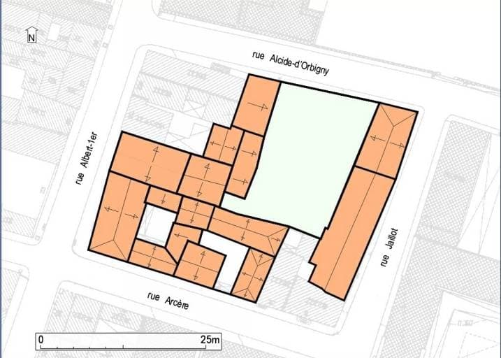 chapelle ; bâtiment conventuel ; maison ; école ; cour ; jardin