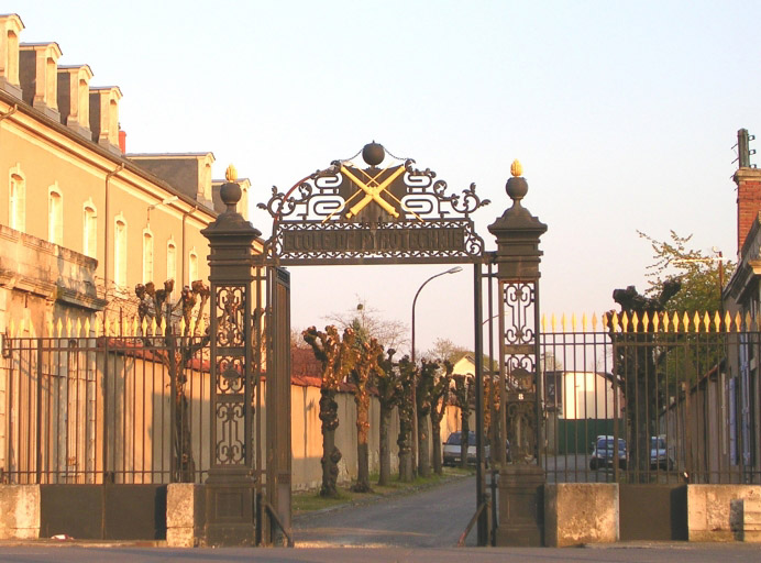 Le portail d'entrée de l'Ecole de Pyrotechnie en fonte est surmonté des emblèmes des artificiers.