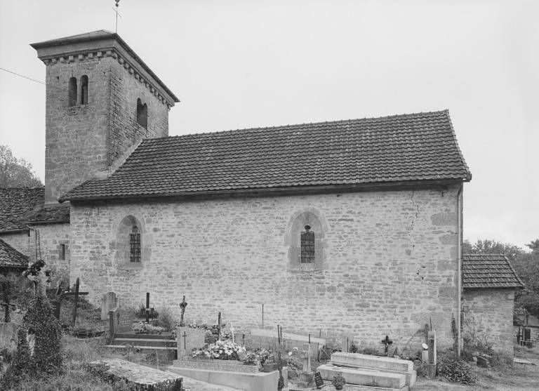 Située en hauteur à l'extrémité est du village, dans l'enclos du cimetière, l'église est bâtie sur un terrain en déclivité est-ouest ; choeur et sacristie sont en partie enterrés. Un porche de plan trapézoïdal, à banquettes de pierre latérales, précède le portail de la nef, à tympan sur coussinets, surmonté au pignon d'un oculus à ébrasement concave. La nef est couverte d'une fausse voûte en berceau qui laisse apparents les quatre entraits de la charpente, de section octogonale ; elle est éclairée par quatre fenêtres en arc brisé à ébrasement intérieur concave et remplage trilobé ; dans le mur sud se trouve un lavabo orné d'un arc en accolade. Moins large, la travée d'avant-choeur, sous clocher, est limitée par deux arcades brisées à impostes et couverte d'une voûte en berceau brisé ; le mur nord est percé d'un jour en archère à encadrement chanfreiné. Le choeur à chevet plat, plus étroit, est voûté également en berceau brisé ; une fenêtre en plein-cintre, étroite et ébrasée, est ouverte dans les murs latéraux, la fenêtre gauche étant occultée par la sacristie accotée au mur nord du choeur ; le mur du chevet comporte une baie plus large en arc brisé (remplage refait) et ébrasement extérieur concave. La sacristie, dont la porte est dissimulée par le lambris, est couverte d'une voûte en berceau plein-cintre transversal et éclairée par une fenêtre rectangulaire au mur-pignon. L'accès au clocher se fait par un escalier extérieur parallèle au mur sud de l'avant-choeur. La tour du clocher, de plan rectangulaire, est percée sur ses quatre faces de baies jumelées en plein-cintre dont les arcs reposent au centre sur deux colonnettes de section octogonale (celles de la baie ouest ont disparu) ; les murs sont couronnés d'une corniche à modillons ; on voit dans le mur sud une porte haute sous un arc en plein-cintre muré. La couverture du porche, de la nef et de la sacristie est en tuile mécanique, celle du choeur en pierre plate ; le toit en pavillon du clocher est couvert d'ardoise.
