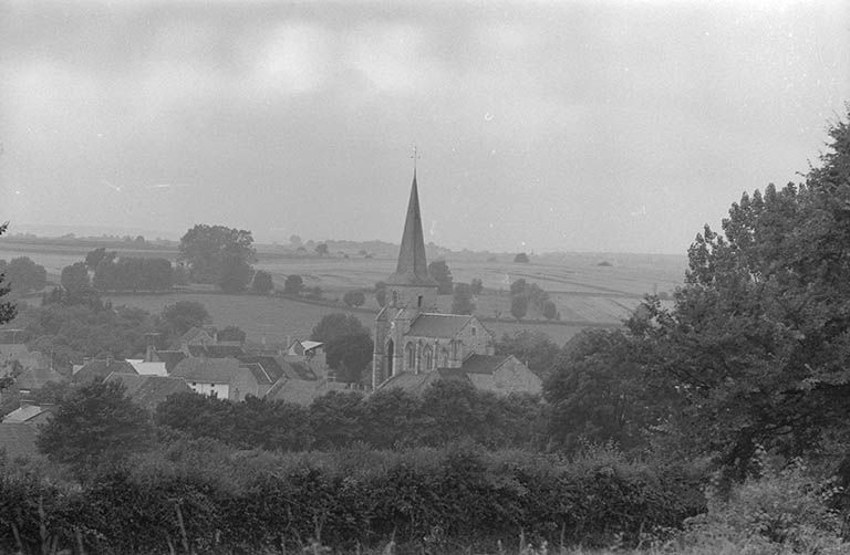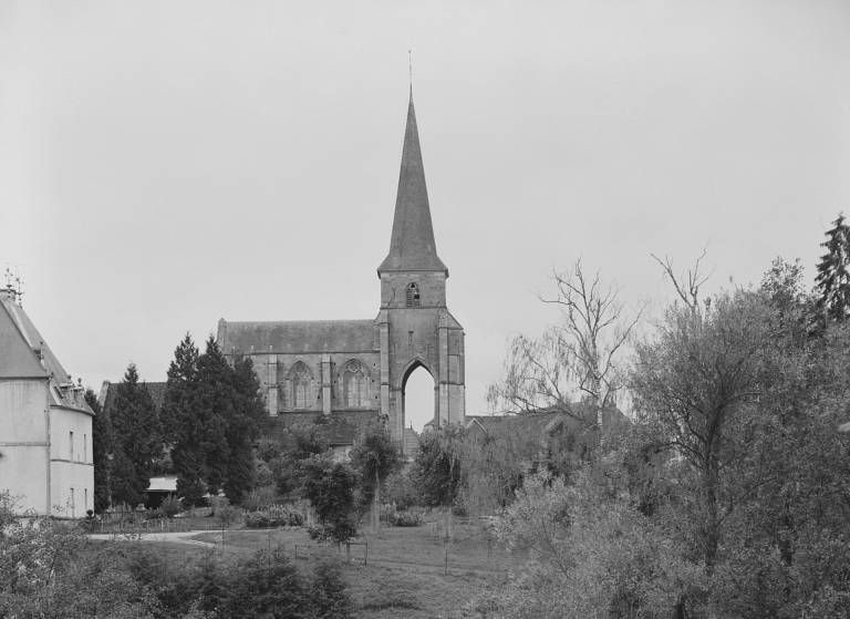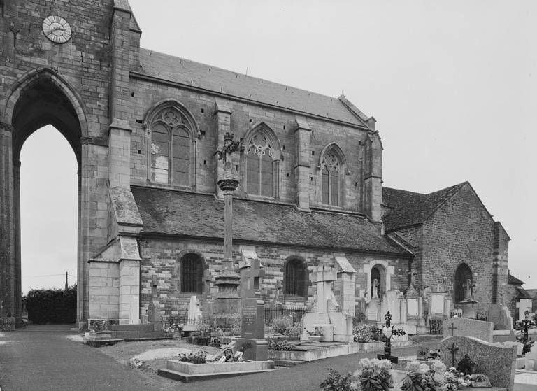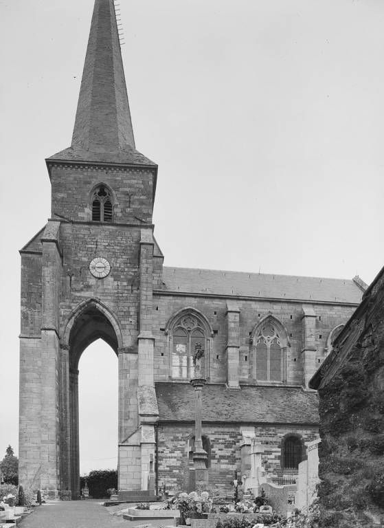 Située au centre du village, en bordure de la rue principale, l'église est entourée du cimetière. La nef à trois travées comprend un haut vaisseau central, couvert de fausses voûtes d'ogives, et des bas-côtés voûtés d'arêtes ; les trois vaisseaux communiquent par de grandes-arcades brisées à ressaut, dont le premier rouleau repose sur un pilastre à chapiteau sculpté. Un bandeau chanfreiné règne sur les murs latéraux du vaisseau central, au-dessus des grandes-arcades. Le transept bas, peu saillant, dont les bras sont voûtés en berceau brisé et dont la croisée est couverte d'une voûte d'ogives, précède la travée unique du choeur à chevet plat, flanqué de deux chapelles ; le choeur et la chapelle sud sont voûtés en berceau brisé, la chapelle nord (actuelle sacristie) , plus vaste, à l'alignement du chevet et du bras nord du transept est voûtée d'ogives sur culots. A l'exception des fenêtres hautes des deux premières travées de la nef et de celle du bras nord du transept, en arc brisé à deux lancettes et trèfle de réseau, l'ensemble des baies a été très remanié, notamment le portail et les fenêtres de la façade ouest, ainsi que les fenêtres en plein-cintre des bas-côtés. Le vaisseau central est précédé d'un clocher-porche, épaulé par des contreforts d'angle jumelés en équerre. Le porche, de même hauteur que le vaisseau central, est ouvert sur trois côtés par de hautes arcades brisées à double rouleau ; il est couvert d'une voûte d'ogives à clef annulaire. L'étage du beffroi, percé sur trois faces d'une baie en arc brisé à remplage, est desservi par un escalier en vis situé entre les contreforts du pilier antérieur gauche ; une baie rectangulaire à encadrement chanfreiné est ouverte dans la face est. Le clocher est couvert d'une flèche octogonale.