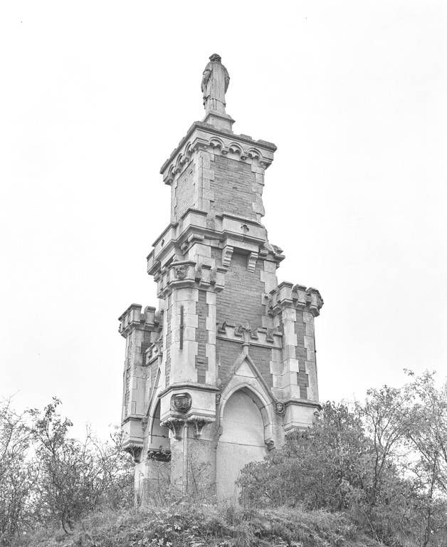 Situé au nord du village, le monument s'élève sur un tertre rocheux. Construit en brique et pierre dans le style néogothique, il a la forme d'une tour de plan carré à trois niveaux, cantonnée de tourelles en surplomb. Le niveau inférieur, ouvert sur trois côtés par des arcades brisées couronnées d'un gâble, abrite une chapelle couverte d'une voûte d'ogives ; la clé de voûte porte les armes de la famille et sa devise "ENSE ET TOGA". Une statue de saint Etienne surmonte l'édicule.