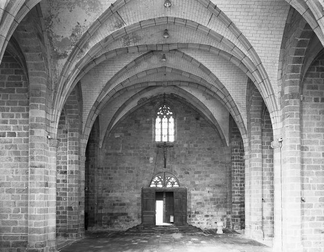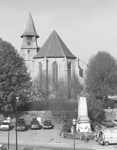 Cette église de type languedocien est construite en blocs de granite assisés, à l'exception des maçonneries basses, entre les contreforts, bâties en moellons ; voûtée d'ogives, elle est composée d'une très large nef à trois travées, de huit chapelles latérales, moins hautes que la nef, de forme carré et séparées par des murs qui forment des contreforts intérieurs ; le choeur, de même largeur que la nef, avec voûte en forme d'étoile à six branches, forme abside à cinq côtés. Deux chapelles ouvrent sur le choeur (la chapelle nord servait de sacristie et celle du sud a été reconstruite). Dans la nef, les supports comportent des piliers rectangulaires chanfreinés auxquels est adossée une demi-colonne ronde avec soubassement polyédrique et base circulaire ; depuis le chapiteau des colonnes avec astragale rond et mouluré, corbeille à décor sculpté et tailloir semi-octogonal, partent les doubleaux, les branches d'ogives et les formerets. Dans les chapelles, les voûtes d'ogives retombent sur des consoles d'angles sculptées ; chaque chapelle comporte une fenêtre en tiers-point. La clef de voûte de la troisième travée porte la date 1553 ; la chapelle sud de cette même travée présente une voûte percée d'un large oculus destiné au passage des cloches. Les retombées de la voûte d'ogives du choeur, en forme d'étoile, se font sur des colonnes engagées, de part et d'autre des cinq baies à double lancette, aménagées chacune dans un pan de l'abside ; la clef de voûte du choeur porte la date 1892. Une porte aménagée dans le mur ouest de la première chapelle latérale sud, donne accès à la tour de l'escalier en vis qui mène à l'étage de comble et au clocher qui surmonte la chapelle sud de la troisième travée. Dans l'élévation ouest, formant un large mur pignon découvert qui englobe à la fois la nef et les chapelles latérales, s'ouvre le portail de style flamboyant. Au-dessus de la large baie en arc brisé dominant le portail, court un bandeau mouluré ; une baie décentrée à droite, très petite et en plein cintre, éclaire les combles. Au-dessus du contrefort situé à l'angle sud-ouest de l'élévation, apparaît la tour polygonale en maçonnerie qui abrite l'escalier en vis. Les murs gouttereaux et le choeur sont rythmés par l'alternance de contreforts et de haute baies. Le clocher, de plan carré, est percé de baies hautes en arc brisé ; il est couronné d'une toiture à quatre pans, évasée inférieurement, percée d'abat-sons et coiffée d'une flèche en charpente octogonale, le tout recouvert de bardeaux ; le mur sud du clocher est soutenu par de hauts contreforts.
