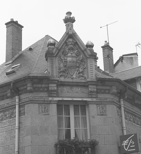 La conception du bâtiment, présentant un sous-sol et un étage carré, a été réalisée de manière à valoriser la travée centrale qui occupe un pan coupé et qui comporte, au rez-de-chaussée, l'entrée principale de la banque, précédée de trois degrés ; le couronnement de cette travée par un élément maçonné vertical à fronton triangulaire, mouluré et portant un décor sculpté, conforte ce parti pris. L'ensemble des trois élévations est rythmé par trois bandeaux, le bandeau supérieur souligné d'une frise de céramique et par une large corniche elle-même traitée avec des éléments en céramique et portant la date de construction : 1904. La partie basse des élévations, jusqu'au premier bandeau courant au niveau des allèges des baies du rez-de-chaussée, est traitée en appareil de revêtement irrégulier, alors que le reste est traité en pierre de taille.