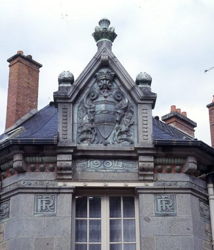 Armoiries de la ville de Felletin sculptées sur l'amortissement : d'or à trois fasces de gueules, celle du milieu chargée de trois feuilles de laurier d'argent. Initiales R F sculptées de part et d'autre de la fenêtre de la travée centrale. Feuilles de laurier sculptées de part et d'autre des armoiries et éléments végétaux sculptés sur les amortissements du support des armoiries et sur la frise en céramique.