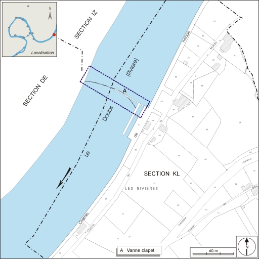 Le barrage poids, en arc de cercle, relie sur plus de 90 m la rive droite à l'écluse en lit de rivière, rive gauche. La bouchure (vanne clapet) est située vers son centre, côté rive gauche. De type anti-torsion, le volet métallique (clapet) pivote horizontalement sur sa base : il s'abaisse au fond du cours d'eau, laissant au flot un passage de 17 m de large sur une hauteur utile de 1, 30 m. Il est actionné par un vérin hydraulique de 50 t. La passerelle d'accès a été enlevée mais les massifs en béton lui servant de support sont encore en place.