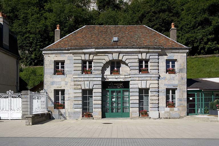 Chargée par les lettres-patentes du 17 octobre 1735 d'organiser la réception des bois de chauffage, leur stockage et leur vente, la municipalité avait, dès 1729, acheté aux négociants qui s'en chargeaient précédemment " arrêts, cordages, engins, machines, barques et barquots et généralement tout ce qui sert à arrêter les bois qui flottent sur la rivière du Doubs jusqu'au port de Rivotte ". Les arrêts sont un système de cordes et de troncs flottant, placés en travers du cours de la rivière pour le barrer, maintenus tendus à l'aide de treuils et supportés, le cas échéant, par des pilots. Un commis les entretient et perçoit les taxes sur les bois. En 1781, le Conseil municipal envisage la construction d'un magasin destiné à la fois au stockage des cordages et autres outils et au logement du commis. Deux projets sont donnés par l'architecte communal Longin (qui en avait déjà élaboré un en 1766) mais c'est celui du contrôleur adjoint Claude-Joseph-Alexandre Bertrand qui est adopté le 25 mai 1782. Consistant en un corps de bâtiment principal, parallèle à la route, et un corps secondaire perpendiculaire, à l'arrière, il est réalisé en 1782 et 1783 par l'entrepreneur Nicolas Strabat. En 1869, le logement est occupé par le commis chargé d'administrer la vente du bois de chauffage et le magasin, après avoir servi de dépôt de matériel de flottage, est devenu manège (?) , écurie du service des voitures de place puis entrepôt loué à un négociant. Le corps à l'arrière est supprimé entre 1876 et 1880 lors de la construction de la voie de chemin de fer Besançon-Morteau. Le bâtiment subsistant est concédé en 1896 au receveur du chantier du bois de la ville puis connaît diverses affectations au 20e siècle : il est transformé en 1932-1933 en école maternelle avec adjonction, en 1956, vraisemblablement dans le logement à l'étage, d'un centre social qui deviendra par la suite la salle municipale J.-C. Pourcelot. Un escalier de distribution extérieur en béton, à cage ouverte, lui est adjoint sur le côté droit lors de ces transformations. Vendu par la ville en 2003, il est converti en restaurant l'année suivante suivant des plans de l'architecte bisontin Claude Koenig : l'escalier extérieur est reconstruit et un petit corps de bâtiment ajouté, toujours sur le côté droit. Les façades et la toiture du corps principal sont inscrites à l'inventaire supplémentaire des Monuments historiques le 15 avril 2004.