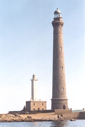 - Description architecturale : £1er phare : £Hauteur au dessus de la mer : 33 m.£Taille générale : 31 m.£Description : Tour carrée surmontant un bâtiment rectangulaire de deux niveaux en maçonnerie de pierre de taille. Tour terminée par une corniche à denticules supportant une rambarde métallique. Lanterne à facettes planes avec abri sur la passerelle pour la sirène de brume.£2e phare : £Hauteur au dessus de la mer : 85 m.£Taille générale : 82, 50 m.£hauteur de la focale 75 m.£Description : Tour cylindrique en granit de moellons de pierres maçonnées avec soubassement de pierre de taille et encorbellement à la partie supérieure de la tour en pierre de taille. Couronnement par consoles assemblées par des arcs supportant une balustrade de pierre. Soubassement avec porte surmontée d'une voûte en arc en plein cintre et maçonnerie de gros pavés de pierre de taille. Terrain 6000 m2. Différents bâtiments annexes : magasins, cellier. Décoration intérieure soignée, opaline aux murs, boiseries dans la salle de veille et de la cuve. Lanterne de très grande taille.£- Description technique : £1ère optique : 1845 : feu fixe blanc varié par des éclats longs rouges toutes les 4 minutes de 3 ème ordre dioptrique.£Autres optiques : £01 mars 1902 : feu à éclat blanc toutes les 5 secondes focale 0, 50 m- Optique double sur cuve à mercure.£19 mars 1903 : feu à éclat blanc toutes les 5 secondes focale 0, 70 m- Optique double sur cuve à mercure. de 4 panneaux au 1/4.£Cuve à mercure : 1902.£Combustibles.£Huile végétale : 1845.£Huile minérale : vers 1875.£Vapeur pétrole : 1902.£Electrification : 1956.£- 28 juillet 1967, installations des aérogénérateurs, remplacés en novembre 1978.£- Etat actuel : Ancien phare : £Tour carrée maçonnerie lisse surmontant un bâtiment rectangulaire en pierres apparentes à deux niveaux. Lanterne fortement modifiée, fenêtres occultées et habitacle vide. Sirène ECAU 2200. Eléments de radiophare sur la passerelle. .£Nouveau phare : £Tour cylindrique Hauteur 82, 5 m en granit sur soubassement circulaire en pierres apparentes. A l'intérieur habillage par plaques d'opalines. Terrains, bâtiments annexes, antenne radiophare, supports d'éoliennes. Au sommet : Lanterne Ø 4 m à 3 niveaux de vitrage cylindrique. Optique à éclats réguliers à 4 panneaux au 1/4 dans caisson moulé aluminium, focale de 0, 50 m. Lampe halo 650W. Cuve à mercure de grande taille à plateau de Ø 3 m. 4 colonnes de marque Barbier et Bénard. Ensemble modifié. Portée 27 milles.