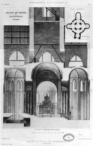 "Malgré sa reconstruction presque intégrale achevée en 1868, l´église Sainte-Croix de Quimperlé demeure un témoin exceptionnel de l´architecture romane en Bretagne. Avec l´ancienne église de Lanleff (Côtes-d´Armor), certes bien plus modeste, elle est, en région, l´unique édifice religieux conçu suivant un plan centré qui se réfère, comme l´ont souligné plusieurs auteurs, au Saint-Sépulcre de Jérusalem. Remontant à l´origine du bâtiment, l´abside du chevet abritant la crypte et l´ancien choeur des moines demeure aujourd´hui l´élément le plus authentique. Les bases et les chapiteaux des colonnes de la crypte se comparent à ceux de la crypte de la cathédrale de Nantes, également construite à l'initiative de l´évêque Benoît vers 1100. Rarement figuratif, ce décor sculpté de feuillages et de rinceaux dénote aussi des parentés stylistiques avec Saint-Gildas-de-Rhuys et Redon. C´est depuis les pays de la Loire que la sculpture monumentale romane s´implante en Bretagne sud et Quimperlé en offre une magnifique illustration. La synthèse de l´édifice roman faite par André Mussat garde toute sa pertinence : ""Par la hardiesse et l´étrangeté de son propos architectural, Sainte-Croix est un grand monument souvent cité par les archéologues peu attirés par la Bretagne romane. Aujourd´hui, ce n´est plus qu´une restitution archéologique approximative ; c´est assez, cependant, pour y voir un édifice exceptionnel. Église à plan central, elle présentait, dans ses dispositions d´origine, un important jeu d´espaces : la combinaison du plan central tréflé, inspiré, selon la dédicace même, de l´église de Jérusalem, avec un grand volume (17,20 m de hauteur pour la coupole nervée et 15,80 m pour les collatéraux annulaires) et une structure axiale de 49 mètres de long, à mouvement ascendant ouest-est. Oeuvre exceptionnelle, souvent comparée à d´autres tentatives du même type inspirées par le culte du Golgatha, comme Charroux en Poitou ou Neuvy-Saint-Sépulcre en Berry, elle surprend dans un milieu en pleine reconstruction, sans grande tradition architecturale, tant par la hardiesse de son plan, le traitement de l´espace et des circulations, que par la maîtrise des types de voûtement."" Quant à l´ancienne tour-clocher de la fin du 17e siècle (disparue), elle rappelle certaines réalisations morbihannaises contemporaines, notamment Saint-Gildas d´Auray."