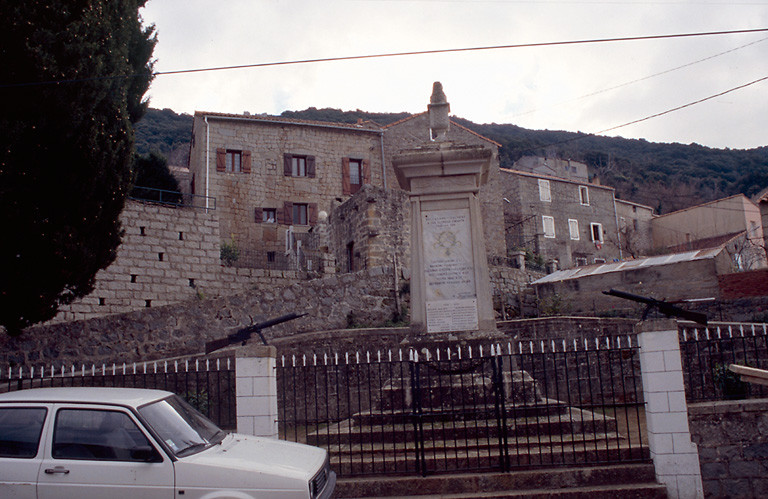 En novembre 1920, le maire expose au conseil municipal qu'un comité d'action patriotique a fait don à la commune d'un monument commémoratif à élever sur un emplacement qui a été cédé gratuitement à cet effet par la famille Colonna d'Istria. Il devra être exécuté sur les plans et modèle conçus par Philippe Poggionovo qui dirigera les travaux et en aura la surveillance... le monument sera en granite poli avec des panneaux de marbre sur lesquels seront gravés environ 50 noms. Il aura 6 m de haut et reposera sur une plateforme qu'une grille en fer contournera. Il se composera d'un socle sur lequel sera posé un cénotaphe. Celui-ci supportera quatre colonnes carrées troncs coniques que surmonteront la frise et le chapiteau. Un vase avec une flamme couronnera l'ouvrage..." (A. D. Corse-du-Sud - 1 M 359). Devis estimatif dressé par l'architecte Poggionovo dressé le 22 novembre 1920 d'un montant de 25 850 francs. Monument aux morts érigé en 1921, à la demande du député-maire Célestin Caïtucoli, en l'honneur des morts de la guerre 1914-1918. Au milieu du 20e siècle, lui fut adjoint une plaque commémorant les morts de la seconde guerre mondiale.